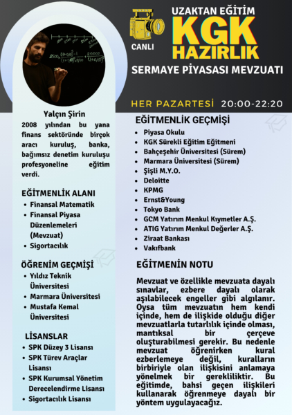 Yalçın hocamdan ilk defa SPK dersi aldım, sayesinde hem SPK yı sevdim hem de kendime güvenim geldi. İşin mantığını kavratıp ezberi ortadan kaldırdı. SPK hiç aklımda yokken sayesinde bu lisansı da alacağım. Emekleriniz için teşekkürler hocam.